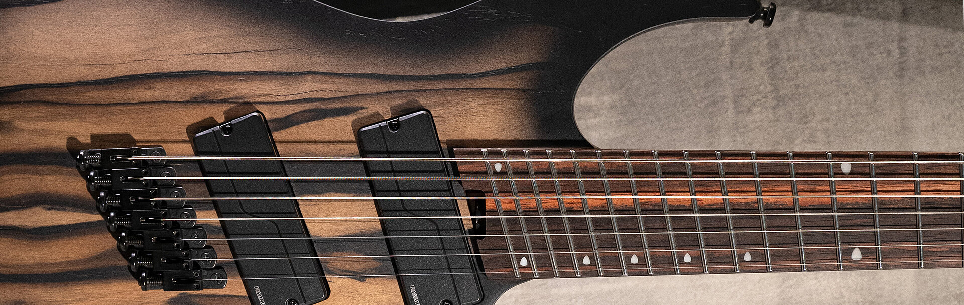 Die Grundlage bildet der modern geschnittene Doppel-Cutaway-Korpus aus Mahagoni, kombiniert mit einer Decke aus Pale Moon Ebony, welches durch seine exotische Maserung auffällt. Der geschraubte 5-teilige Hals besteht Ahorn & Amaranth, das Griffbrett ist aus Makassar-Ebenholz gefertigt.