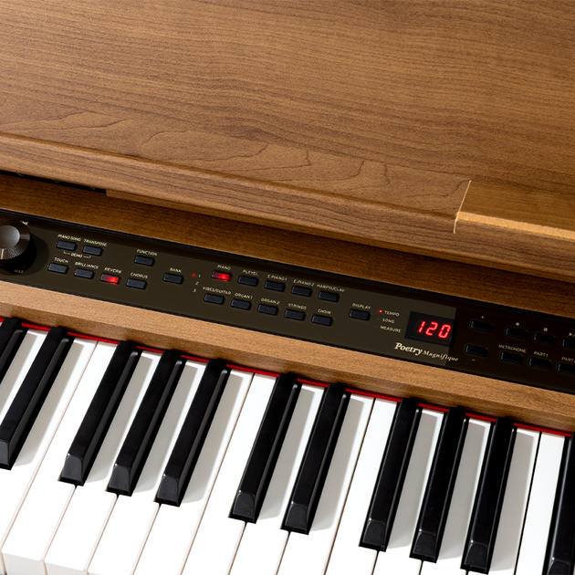 Mit dem Poetry Magnifique stellt KORG ein außergewöhnliches Digitalpiano vor, das sich ganz wie sein kleineres Schwestermodell „Poetry“ dem international gefeierten Komponisten Frédéric Chopin verschrieben hat. Herzstück des Poetry Magnifique sind auch hier zwei Konzertflügelsounds auf Weltklasse-Niveau: Das liebevoll restaurierte und in filigraner Detailarbeit gesampelte PLEYEL Piano von 1843, dem 33. Lebensjahr Chopins, das sich auf Wunsch auch in der historisch-korrekten Stimmung von 430 Hz spielen lässt, sowie der moderne italienische Konzertflügel, der von führenden Pianisten aus aller Welt geschätzt wird. Das Poetry Magnifique hebt sich von seinem Schwestermodell durch eine moderne, klare Linienführung mit komplett ebener Tastaturabdeckung sowie dem neu entwickelten EvoTone Lautsprechersystem mit 2 x 40 Watt Leistung ab. Sein klassisches Design in „Poetic Brown“, 50 integrierte Demo-Stücke von Chopin sowie ein beiliegendes Notenheft mit 23 ausgesuchten Klavier-Werken des Meisters runden das einzigartige Konzept dieses besonderen Instruments perfekt ab.